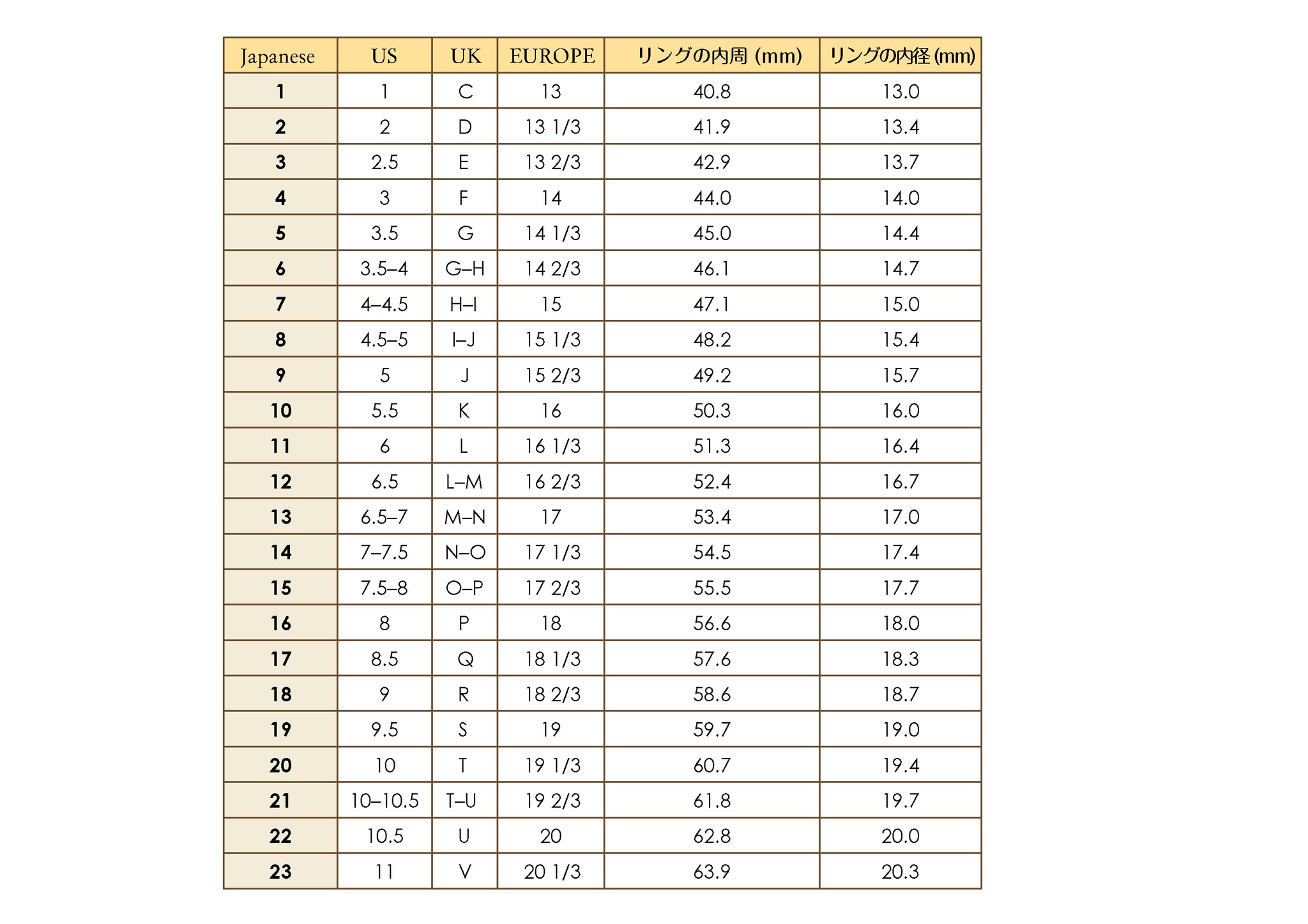 | (JP)SIZE | 内周(mm) | 内径(mm) | (US) SIZE | ISO/JIS (FR)SIZE | | 1号 | 40.8 | 13 | 1.8 | 40.8 | | 2号 | 41.9 | 13.4 | 2.2 | 41.9 | | 3号 | 42.9 | 13.7 | 2.6 | 42.9 | | 4号 | 44 | 14 | 3.0 | 44.0 | | 5号 | 45 | 14.4 | 3.4 | 45.0 | | 6号 | 46.1 | 14.7 | 3.8 | 46.1 | | 7号 | 47.1 | 15 | 4.2 | 47.1 | | 8号 | 48.2 | 15.4 | 4.6 | 48.2 | | 9号 | 49.2 | 15.7 | 5.0 | 49.2 | | 10号 | 50.3 | 16 | 5.4 | 50.3 | | 11号 | 51.3 | 16.4 | 5.8 | 51.3 | | 12号 | 52.4 | 16.7 | 6.2 | 52.4 | | 13号 | 53.4 | 17 | 6.6 | 53.4 | | 14号 | 54.5 | 17.4 | 7.0 | 54.5 | | 15号 | 55.5 | 17.7 | 7.4 | 55.5 | | 16号 | 56.5 | 18 | 7.8 | 56.5 | | 17号 | 57.6 | 18.4 | 8.2 | 57.6 | | 18号 | 58.6 | 18.7 | 8.6 | 58.6 | | 19号 | 59.7 | 19 | 9.0 | 59.7 | | 20号 | 60.7 | 19.4 | 9.4 | 60.7 | | 21号 | 61.8 | 19.7 | 9.8 | 61.8 |