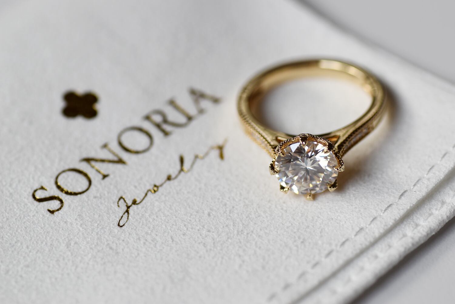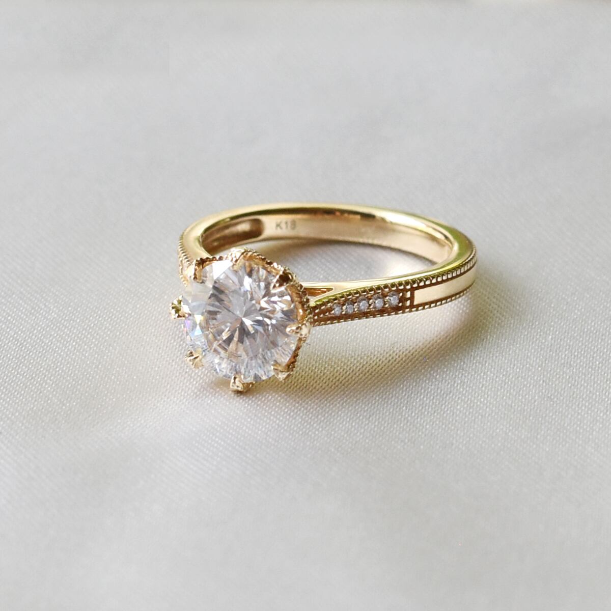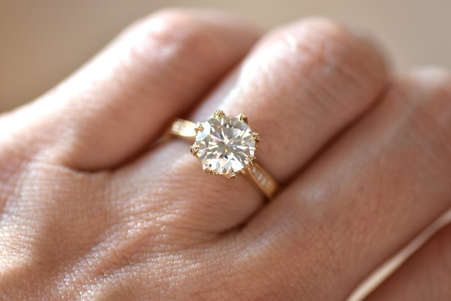 存在感たっぷりの2カラットの一粒ラウンドカットダイヤが豪華なリング。